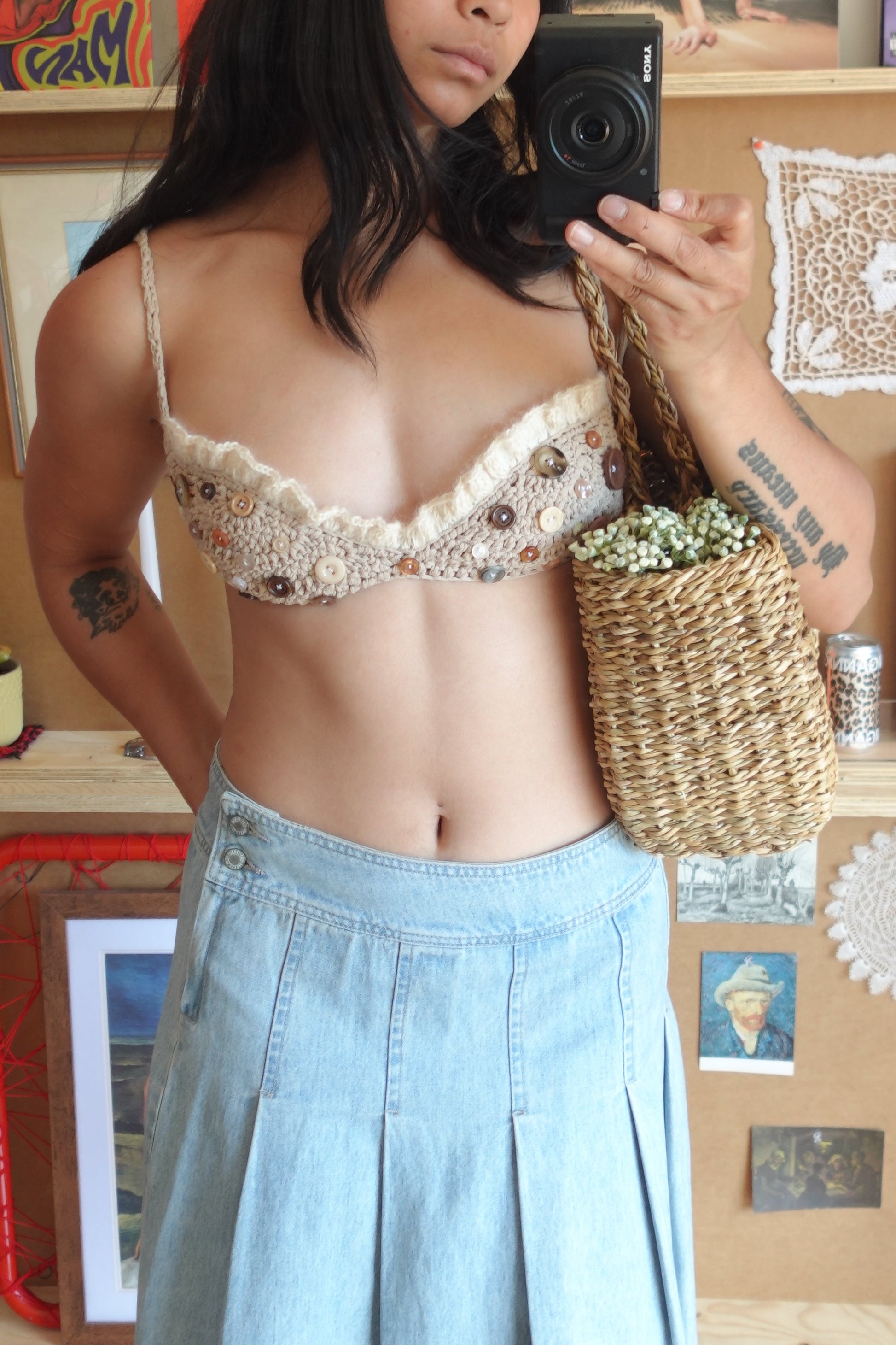 This hand crochet bra is made with breathable cotton yarn and features mohair frills, an assortment of buttons and a tie feature to adjust width size and a beaded end.