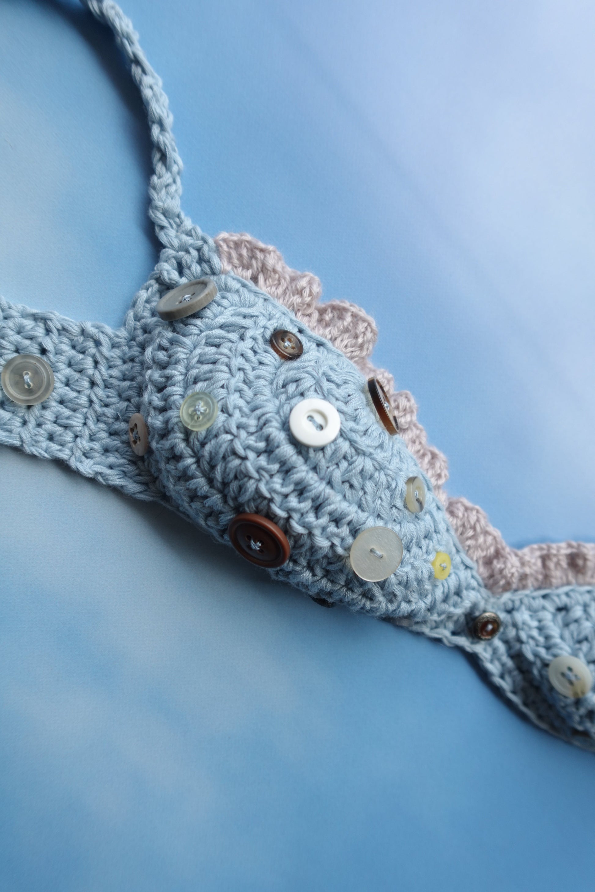 This hand crochet bra is made with breathable cotton yarn and features mohair frills, an assortment of buttons and a tie feature to adjust width size and a beaded end.
