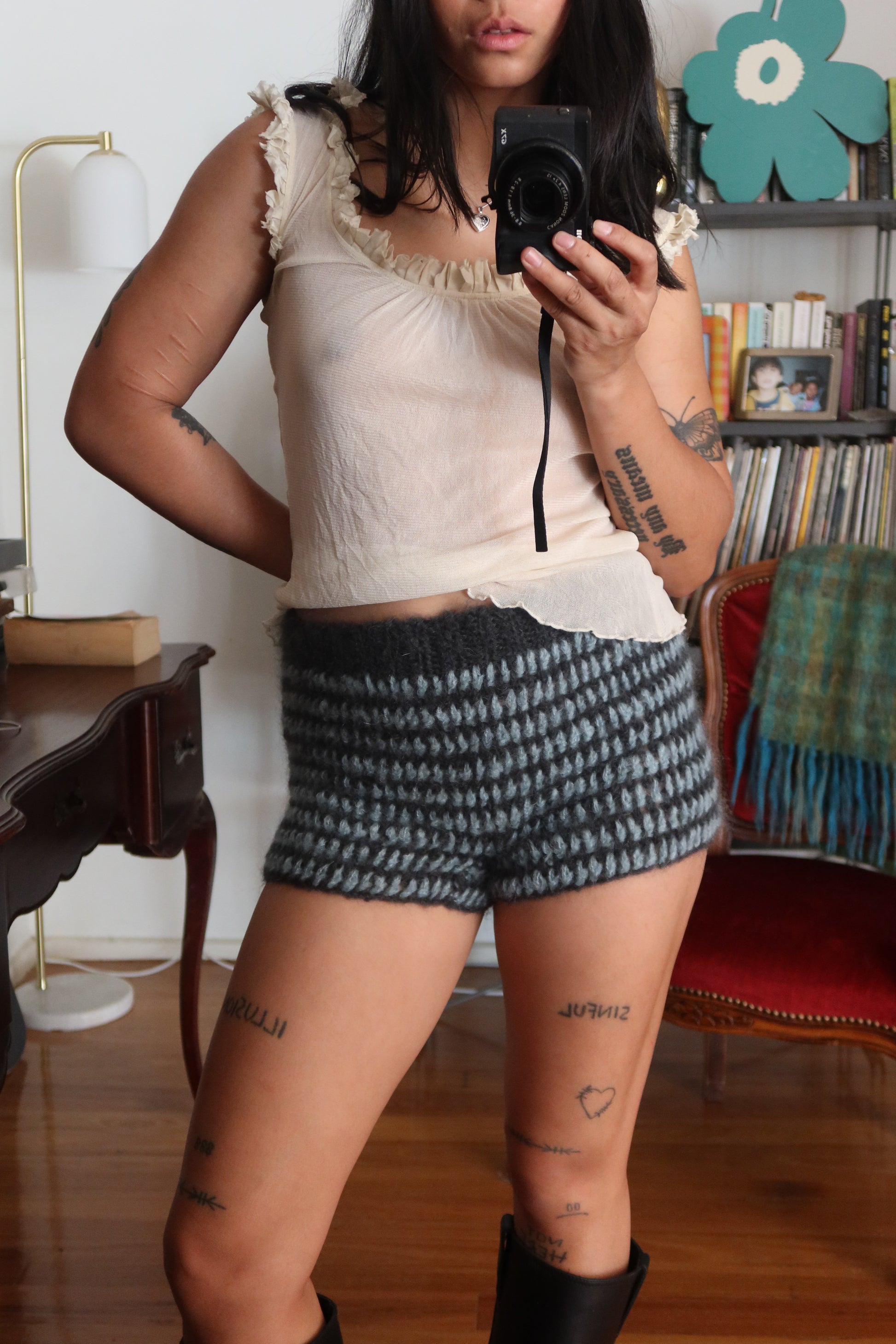 This pair of shorts is made from a blend of mohair, merino wool, and wool binder. The yarn is super soft and sourced from New Zealand x