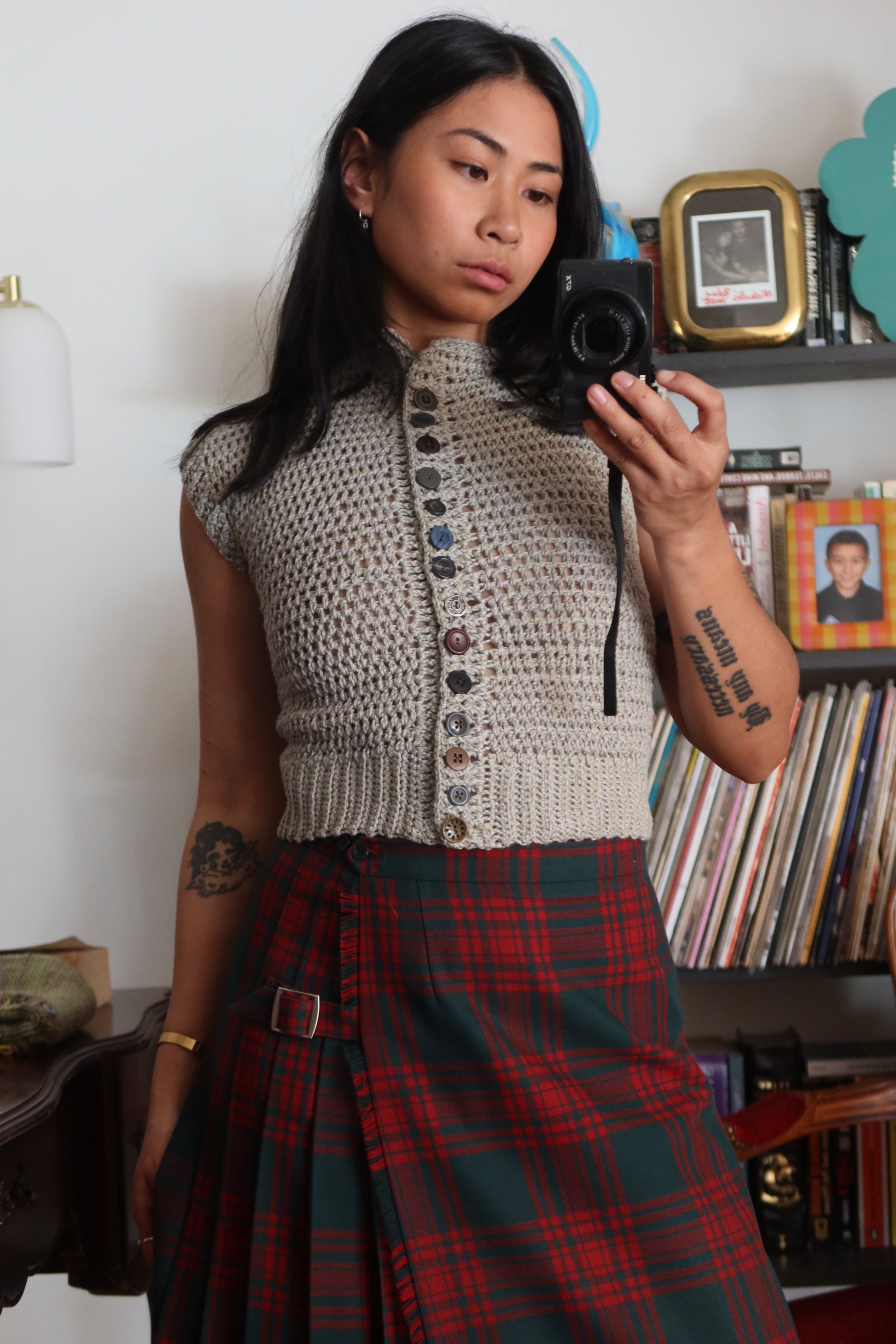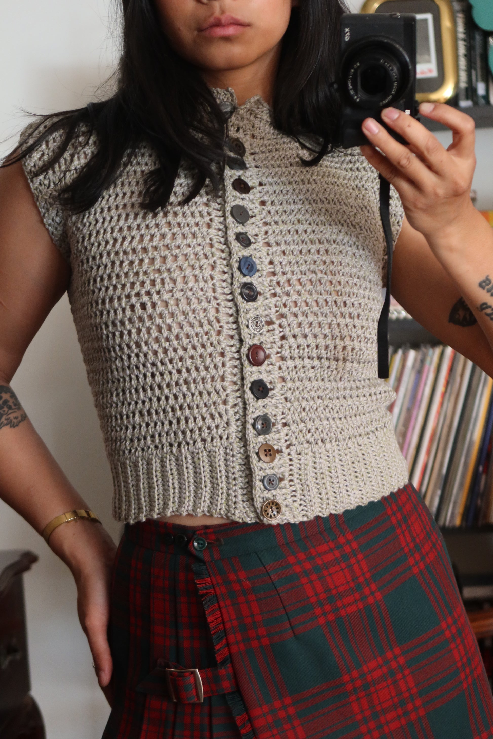 This crochet mini vest is made from vintage yarn made in Turkey If yarn composition is 32% Silk 68% Cotton. Hand sewn on are a unique set of buttons carefully picked to suit the colour of this vest.